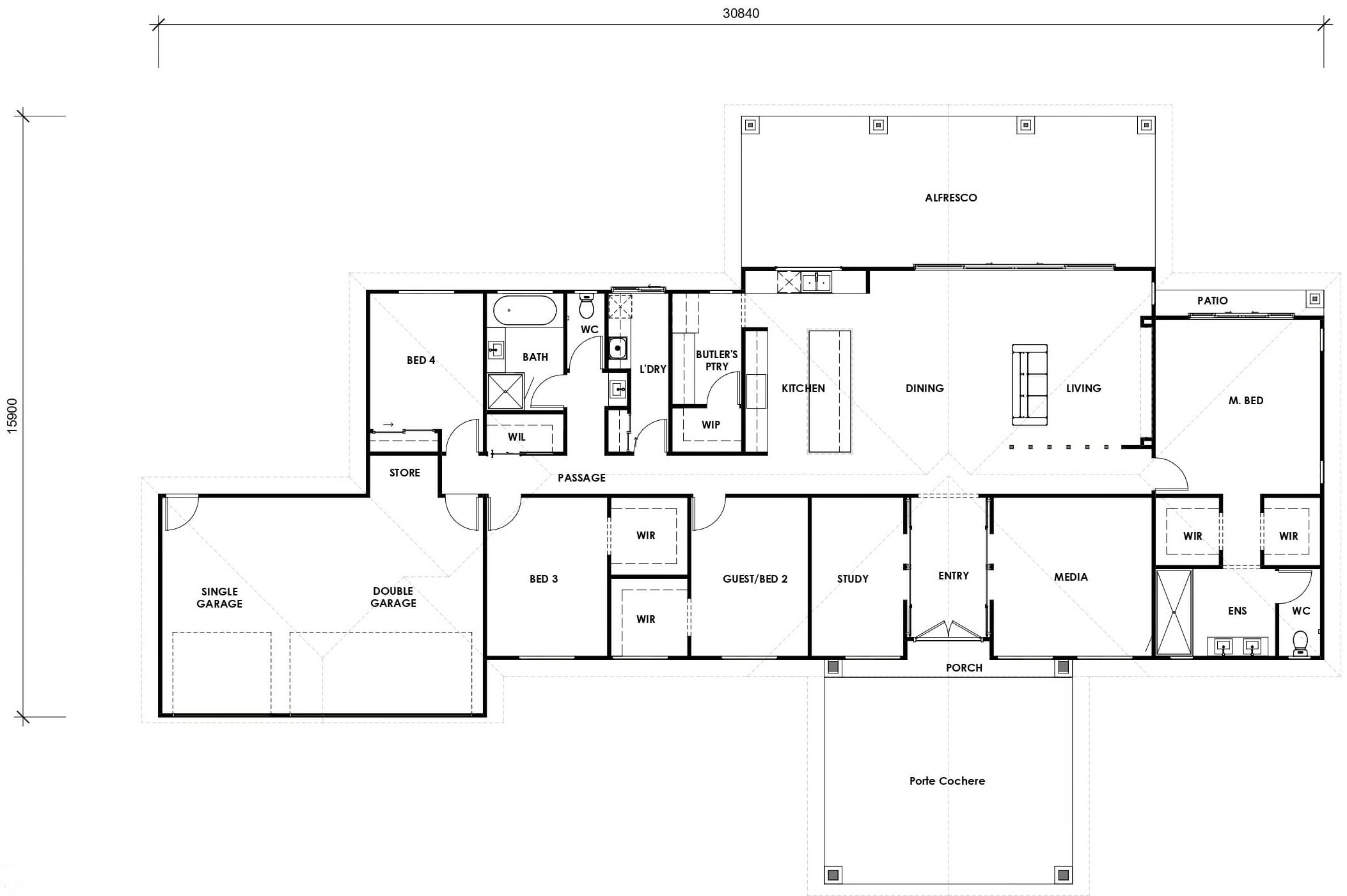 The MONTVILLE 372 is the ultimate expansive acreage home with show stopping Porte Cochere and three bay garage. The raked ceilings through the living area create a great sense of space for family living.